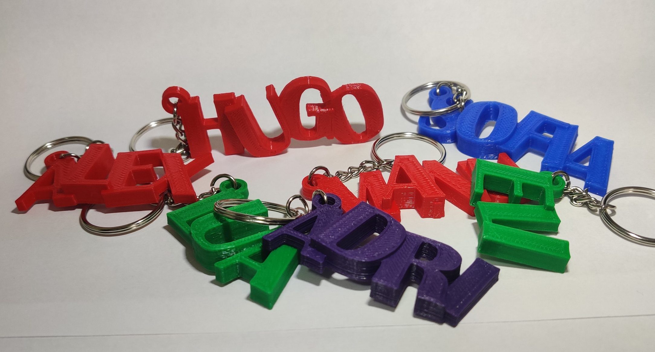 Llaveros impresos en 3D con diseño personalizado. Elige tu palabra, deporte o símbolo favorito y llévalo contigo.